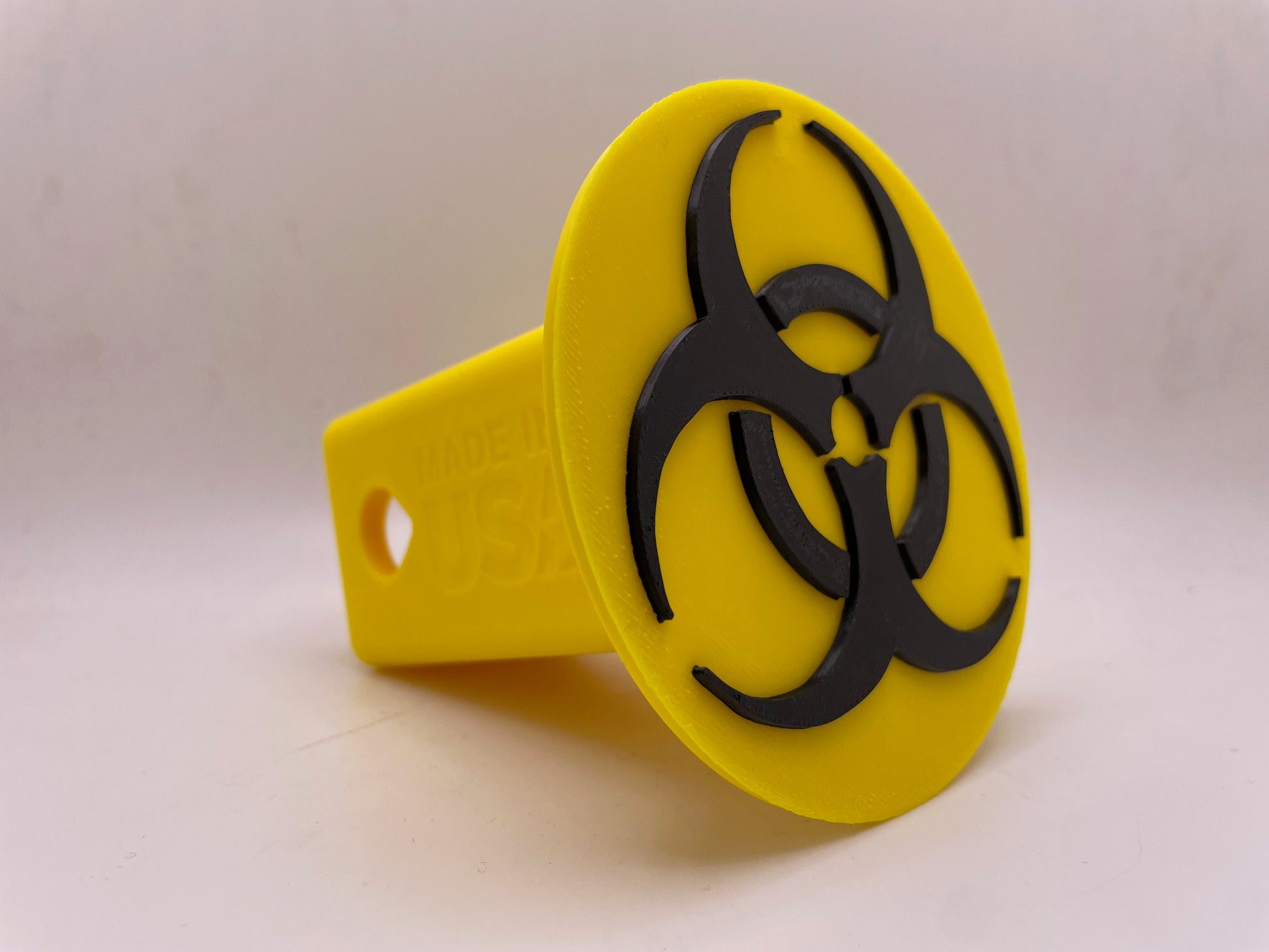 Introducing this eye-catching trailer hitch cover featuring the iconic biohazard symbol. Made using 3D printing technology, this durable and weather-resistant accessory adds a touch of edgy style to your vehicle's rear end. Designed to fit standard 2-inch receiver hitches, it securely covers the hitch opening when not in use, protecting it from dirt and debris. The vibrant yellow color with contrasting black biohazard emblem creates a bold, attention-grabbing look that's sure to turn heads. Easy to install and remove, this hitch cover is a must-have for those seeking to personalize their ride with a unique and distinctive flair.